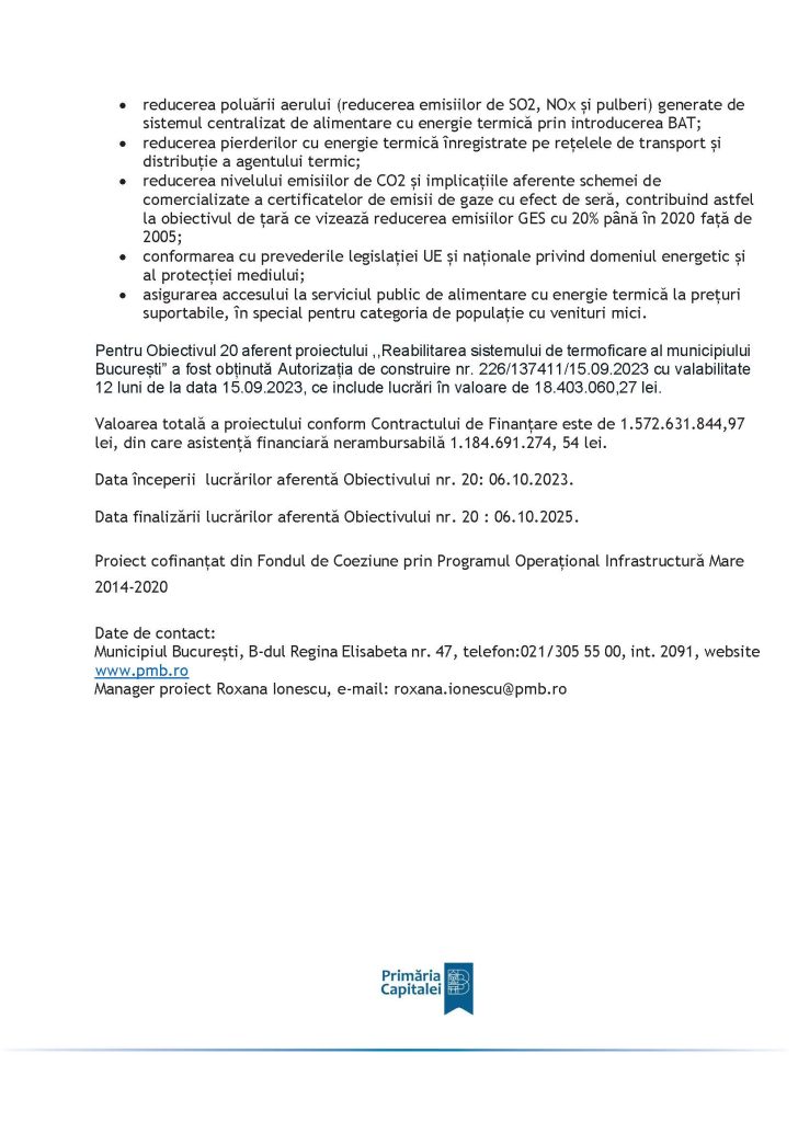 Pentru Obiectivul 20 aferent proiectului ,,Reabilitarea sistemului de termoficare al municipiului București” a fost obținută Autorizația de construire nr. 226/137411/15.09.2023 cu valabilitate 12 luni de la data 15.09.2023, ce include lucrări în valoare de 18.403.060,27 lei.