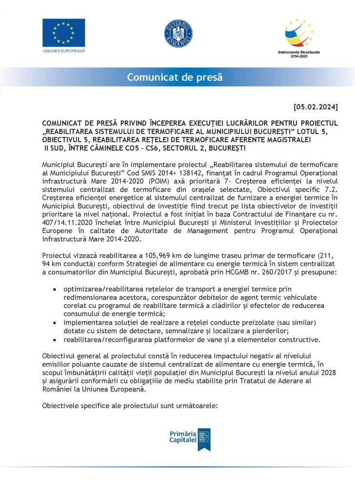 „REABILITAREA SISTEMULUI DE TERMOFICARE AL MUNICIPIULUI BUCUREȘTI” LOTUL 5, OBIECTIVUL 5, REABILITAREA REȚELEI DE TERMOFICARE AFERENTE MAGISTRALEI II SUD, ÎNTRE CĂMINELE CO5 – CS6, SECTORUL 2, BUCUREȘTI