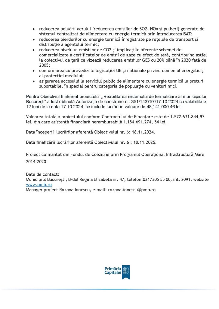 Pentru Obiectivul 6 aferent proiectului ,,Reabilitarea sistemului de termoficare al municipiului București” a fost obținută Autorizația de construire nr. 351/143757/17.10.2024 cu valabilitate 12 luni de la data 17.10.2024, ce include lucrări în valoare de 48,141,000.46 lei.