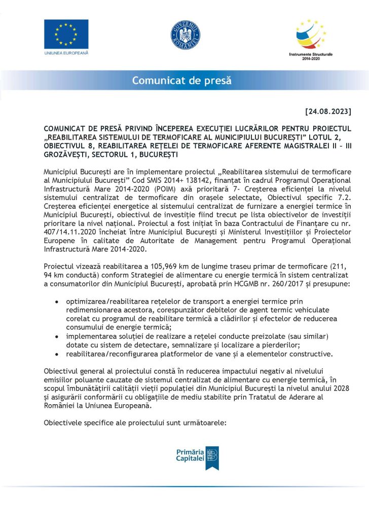 „REABILITAREA SISTEMULUI DE TERMOFICARE AL MUNICIPIULUI BUCUREȘTI” LOTUL 2, OBIECTIVUL 8, REABILITAREA REȚELEI DE TERMOFICARE AFERENTE MAGISTRALEI II – III GROZĂVEȘTI, SECTORUL 1, BUCUREȘTI