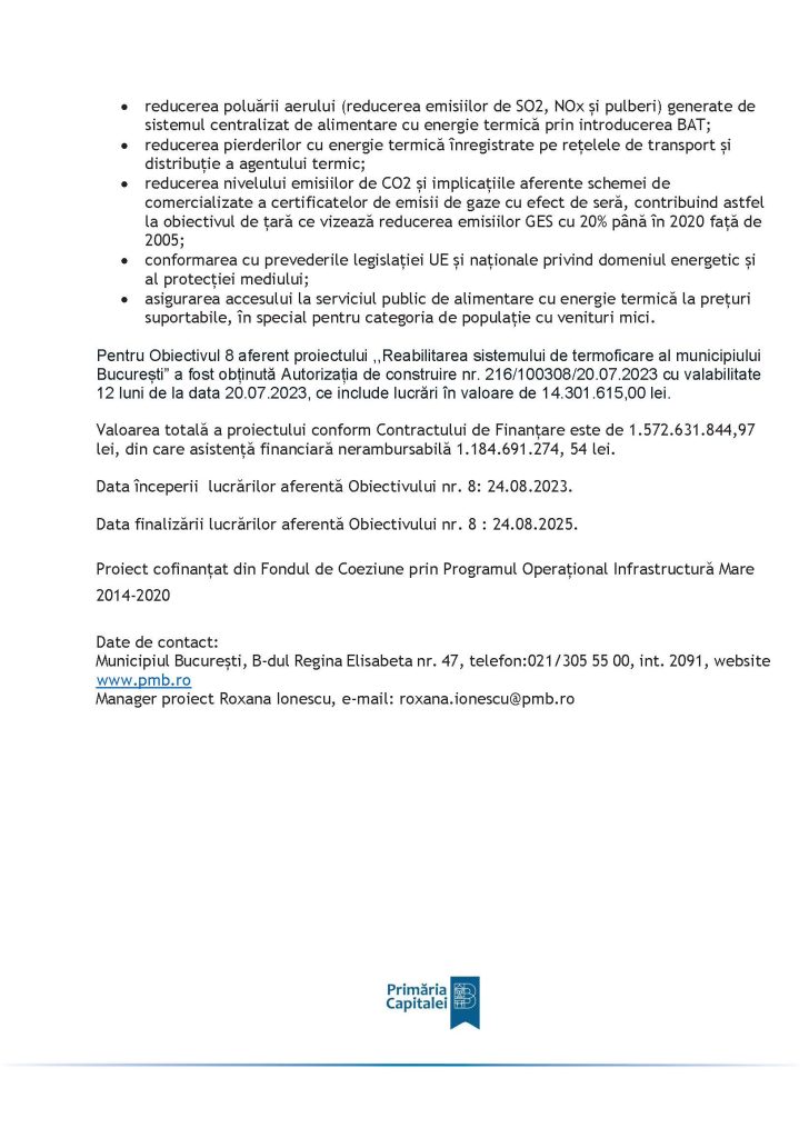 Pentru Obiectivul 8 aferent proiectului ,,Reabilitarea sistemului de termoficare al municipiului București” a fost obținută Autorizația de construire nr. 216/100308/20.07.2023 cu valabilitate 12 luni de la data 20.07.2023, ce include lucrări în valoare de 14.301.615,00 lei.