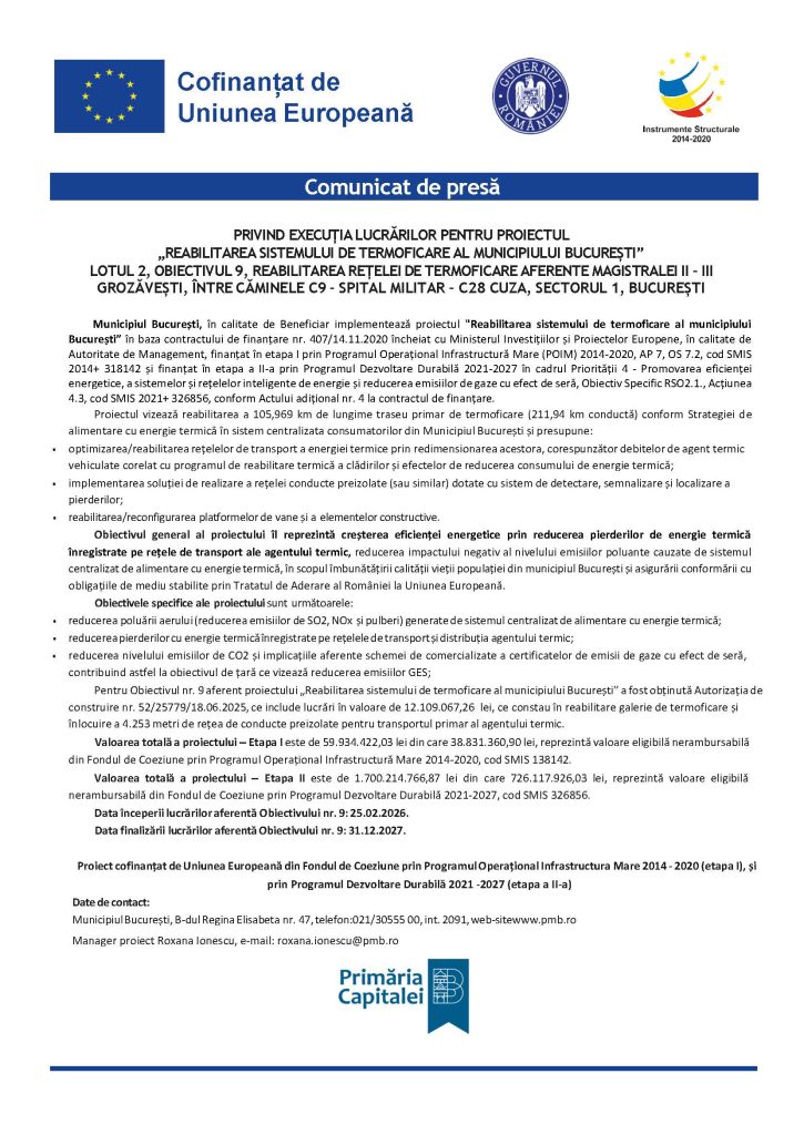 LOTUL 2, OBIECTIVUL 9, REABILITAREA REȚELEI DE TERMOFICARE AFERENTE MAGISTRALEI II – III GROZĂVEȘTI, ÎNTRE CĂMINELE C9 – SPITAL MILITAR – C28 CUZA, SECTORUL 1, BUCUREȘTI