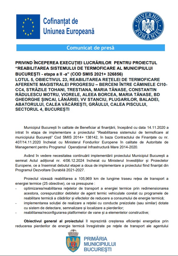 PRIVIND ÎNCEPEREA EXECUȚIEI LUCRĂRILOR PENTRU PROIECTUL“REABILITAREA SISTEMULUI DE TERMOFICARE AL MUNICIPIULUI BUCUREȘTI – etapa a II -a” (COD SMIS 2021+ 326856) LOTUL 5, OBIECTIVUL 23, REABILITAREA REȚELEI DE TERMOFICARE