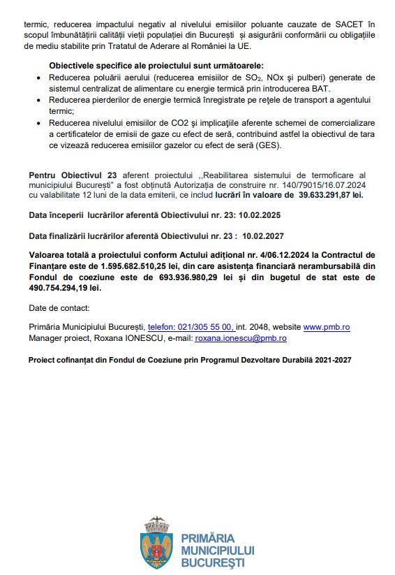 Pentru Obiectivul 23 aferent proiectului ,,Reabilitarea sistemului de termoficare almunicipiului București” a fost obținută Autorizația de construire nr. 140/79015/16.07.2024 cu valabilitate 12 luni de la data emiterii, ce includ lucrări în valoare de 39.633.291,87 lei.